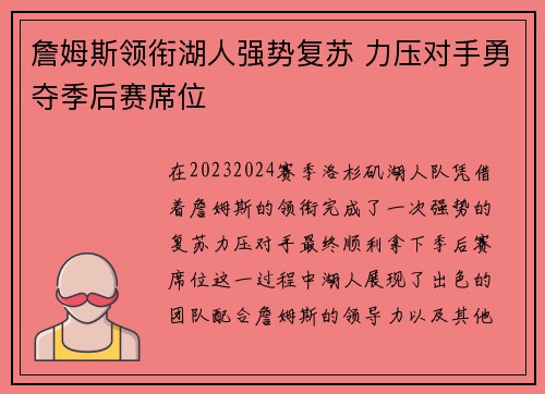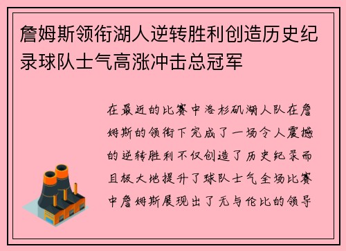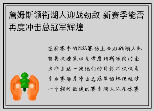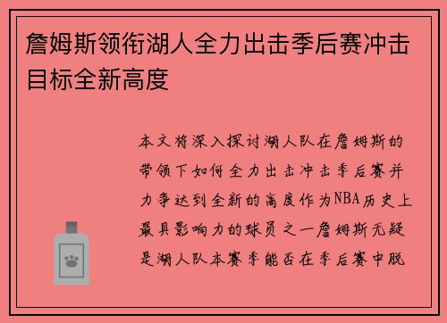 本文将深入探讨湖人队在詹姆斯的带领下,如...