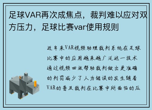 近年来,VAR(视频助理裁判)系统在足球...