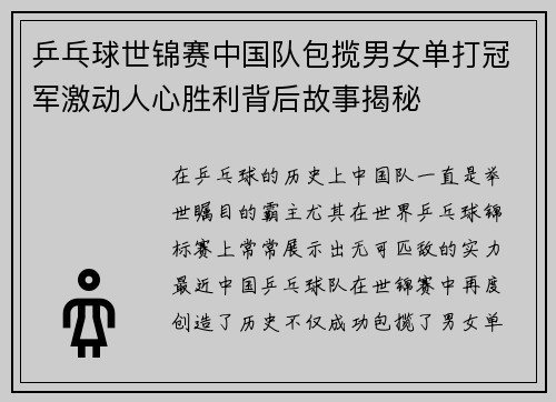 在乒乓球的历史上,中国队一直是举世瞩目的...