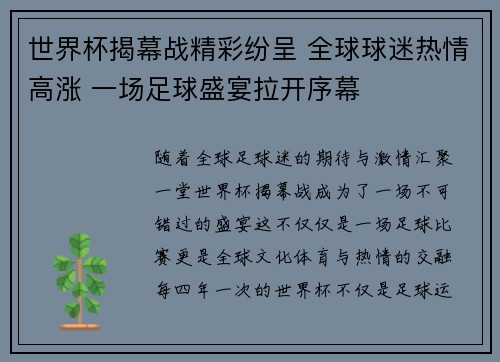 随着全球足球迷的期待与激情汇聚一堂,世界...