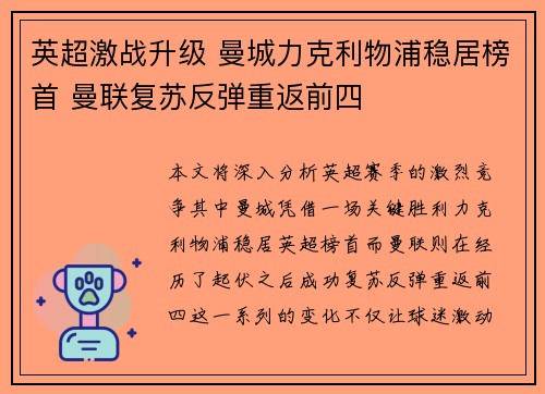 本文将深入分析英超赛季的激烈竞争,其中曼...