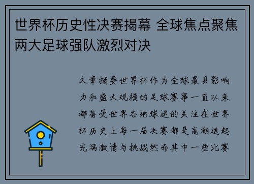 文章摘要:世界杯作为全球最具影响力和盛大...