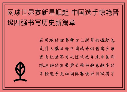 在网球的世界舞台上,新星的崛起总是引人瞩...