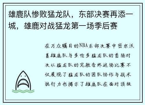 在万众瞩目的NBA东部决赛中,密尔沃基雄...