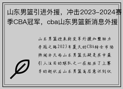 山东男篮迎来新变革,外援加盟助力夺冠之路...